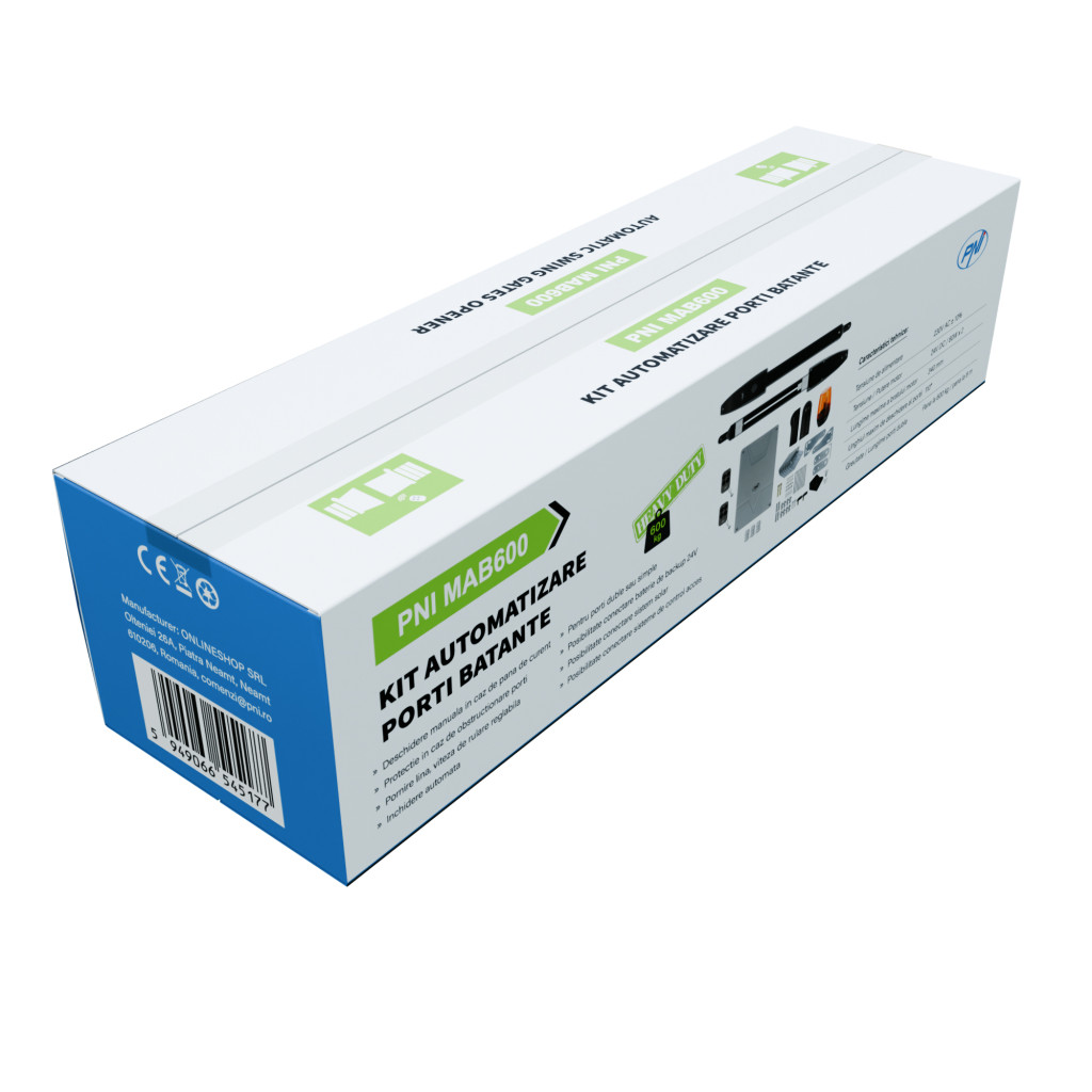 A PNI MAB600 nyílókapu automatizálási készlet egy komplett rendszer, amelyet kétszárnyú kapuk automatizálására terveztek, legfeljebb 3 m hosszú és legfeljebb 600 kg együttes súlyú kapulapok megtartására tervezve. A rendszer két nagy teljesítményű motorral van felszerelve, amelyek képesek szabályozott nyitást és zárást biztosítani, valamint egy központi elektronikus panellel, amely koordinálja a teljes működési ciklust. A műszaki jellemzők közé tartozik a 230 V-os tápegység 24 V-os átalakítással a motorokhoz, valamint a kültéri használatra alkalmas védelmi osztály. Ez a csomag lakó- vagy kereskedelmi ingatlanok számára készült, ahol automatizált és megbízható járműhozzáférés-vezérlésre van szükség.